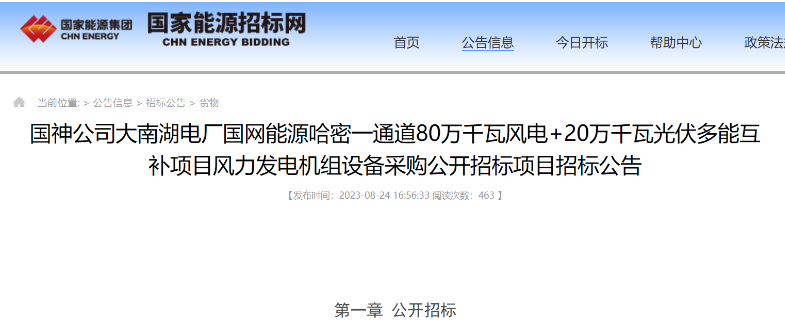公告顯示,國(guó)網(wǎng)能源哈密一通道80萬(wàn)千瓦風(fēng)電+20萬(wàn)千瓦光伏多能互補(bǔ)項(xiàng)目場(chǎng)址位于新疆哈密大南湖地區(qū),工程場(chǎng)址中心距哈密市直線距離約96km,呈不規(guī)則多邊形,占地面積約165.05km²,風(fēng)電場(chǎng)擬安裝128臺(tái)6.25MW風(fēng)力發(fā)電機(jī)組,總裝機(jī)容量800MW,共分為兩個(gè)標(biāo)段:A標(biāo)段400MW,B標(biāo)段400MW。本項(xiàng)目計(jì)劃于2023年9月30日前開(kāi)工(暫定);2024年6月30日前全容量并網(wǎng)發(fā)電。(暫定)