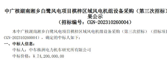 1月2日,中廣核電子商務(wù)平臺發(fā)布《中廣核湖南湘鄉(xiāng)白鷺風(fēng)電項(xiàng)目棋梓區(qū)域風(fēng)電機(jī)組設(shè)備采購(第三次招標(biāo))中標(biāo)結(jié)果公示》的公告。