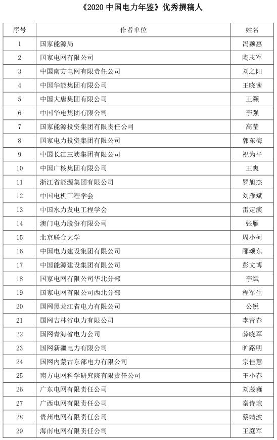 為促進(jìn)《年鑒》編撰質(zhì)量的進(jìn)一步提升,表彰在年鑒編撰工作中表現(xiàn)突出的先進(jìn)個(gè)人,根據(jù)《<中國電力年鑒>優(yōu)秀撰稿人評獎(jiǎng)辦法(試行)》,經(jīng)年鑒編輯部初評、評選委員會(huì)審核,評選出《2020中國電力年鑒》最佳撰稿人和優(yōu)秀撰稿人,現(xiàn)將名單予以公示。
