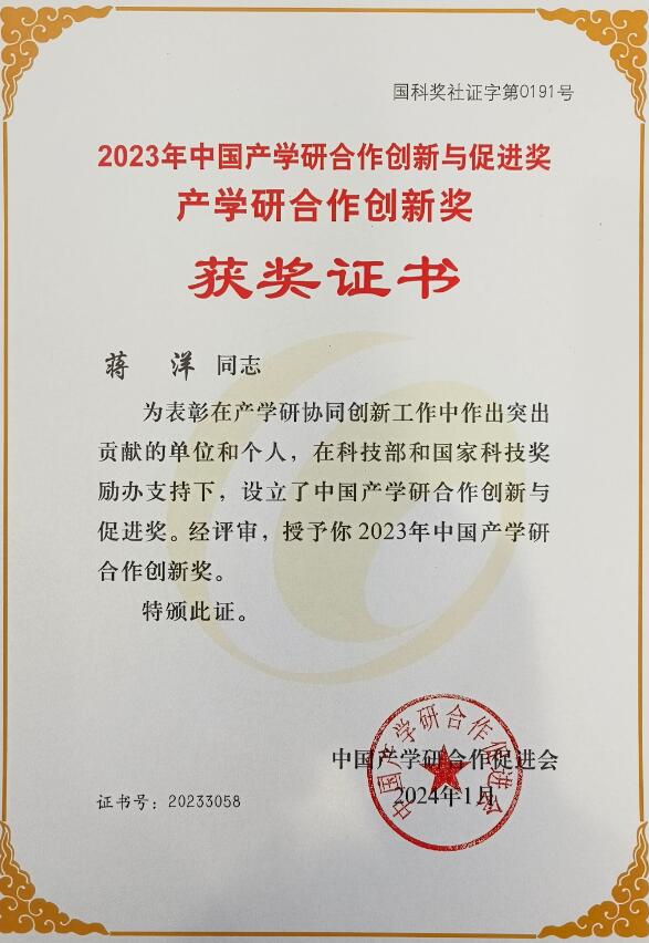 中國能建綠色建材公司黨委書記、董事長,綠色先進(jìn)材料研究院院長蔣洋榮獲“2023年中國產(chǎn)學(xué)研合作創(chuàng)新獎”