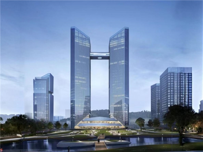 國惠科創(chuàng)中心項(xiàng)目位于濟(jì)南市高新區(qū)漢峪金谷片區(qū),總建筑面積33.51萬平方米,其中一標(biāo)段建筑面積16.7萬平方米。包含兩棟45層商務(wù)辦公樓,建筑高度220米。底部為3層商業(yè)裙房,地下室共5層,包含1層設(shè)備夾層。主要功能為商務(wù)辦公、商業(yè)等。雙子塔樓38至40層設(shè)計(jì)有一個(gè)鋼結(jié)構(gòu)連廊將兩棟塔樓連通,采用鋼桁架結(jié)構(gòu)體系,總重約960噸,鋼連廊距地高度172.5米,跨度45.5米,寬度20.8米,高度9.15米,跨越兩層結(jié)構(gòu)。