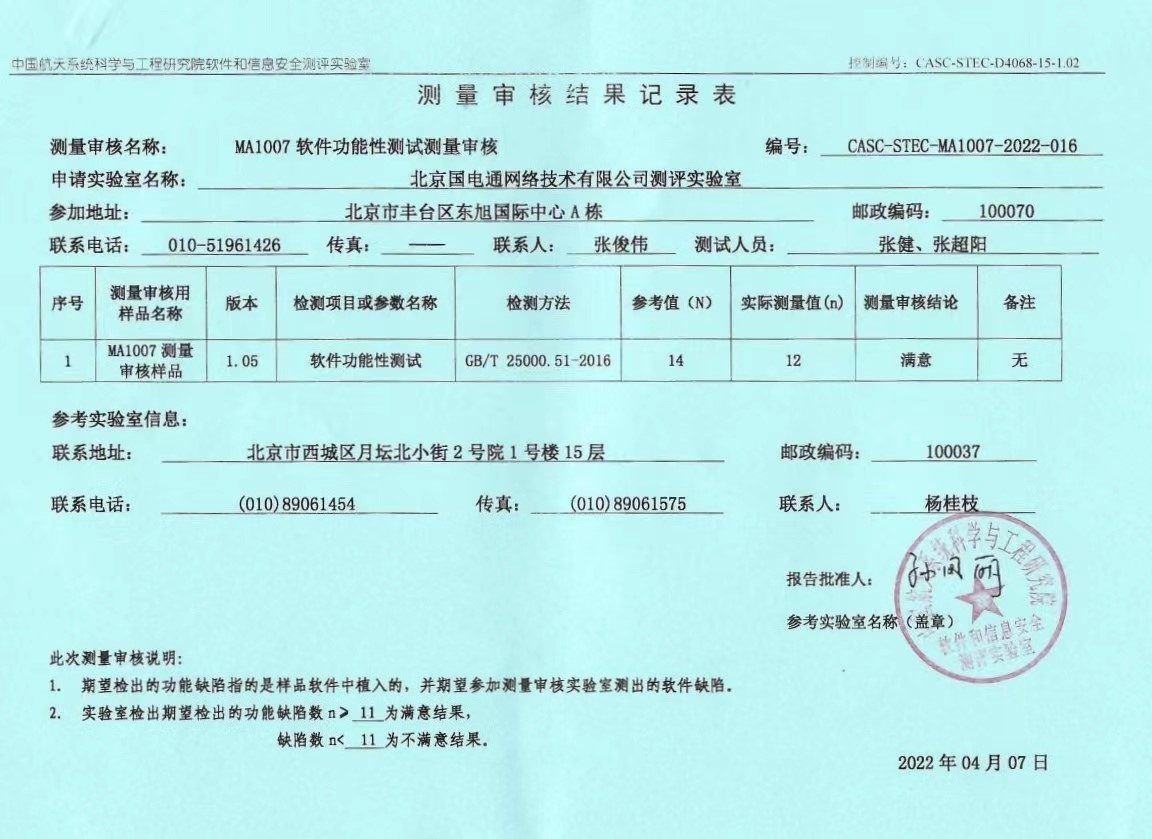 CNAS是由國(guó)家認(rèn)證認(rèn)可監(jiān)督管理委員會(huì)批準(zhǔn)設(shè)立并授權(quán)的國(guó)家認(rèn)可機(jī)構(gòu),統(tǒng)一負(fù)責(zé)對(duì)認(rèn)證機(jī)構(gòu)、實(shí)驗(yàn)室和檢驗(yàn)機(jī)構(gòu)等相關(guān)機(jī)構(gòu)的認(rèn)可工作。獲得測(cè)評(píng)實(shí)驗(yàn)室認(rèn)可(CNAS)資質(zhì),則表明具備了可自主開(kāi)展出廠測(cè)試工作的能力。3月22日至4月2日,信產(chǎn)國(guó)電通測(cè)評(píng)實(shí)驗(yàn)室報(bào)名參與中國(guó)航天科技集團(tuán)有限公司軟件評(píng)測(cè)中心組織開(kāi)展的軟件功能性測(cè)量審核。在測(cè)量審核過(guò)程中,信產(chǎn)國(guó)電通檢測(cè)人員精心組織,嚴(yán)格按照作業(yè)指導(dǎo)書(shū)及軟件功能性測(cè)試技術(shù)標(biāo)準(zhǔn)規(guī)范的要求,認(rèn)真開(kāi)展檢測(cè)工作,成功在規(guī)定時(shí)間內(nèi)反饋出檢測(cè)結(jié)果報(bào)告單和原始記錄。經(jīng)中國(guó)航天科技集團(tuán)有限公司軟件評(píng)測(cè)中心認(rèn)定,本次測(cè)量審核結(jié)果為“滿意”。