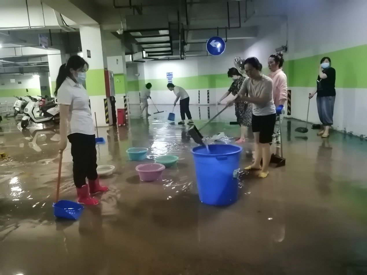 居住地為升龍?zhí)靺R廣場1號院小區(qū)的劉丹,是安質(zhì)部的員工,小區(qū)處于鄭州市中原區(qū),負(fù)二樓全部被淹沒,負(fù)一樓積水近半米。謝丹利用在下班時間,協(xié)助物業(yè)工作人員進(jìn)行車庫清淤工作。積水中混雜大量淤泥,無法使用機(jī)械清淤,大家都是使用掃帚、簸箕等簡單工具手工清理。7月26日晚間,小區(qū)負(fù)一樓地下車庫基本清理完畢,可以正常投入使用。