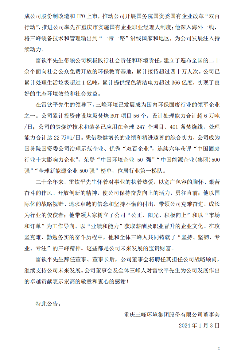 雷欽平辭去重慶三峰環(huán)境集團(tuán)股份有限公司(以下簡(jiǎn)稱“三峰環(huán)境”)董事、董事長(zhǎng)職務(wù)。