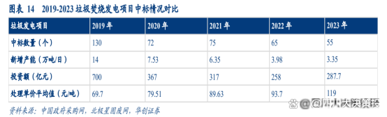 垃圾焚燒新訂單釋放速度繼續(xù)減緩、處理費(fèi)價(jià)格提升。2023 年垃圾焚燒新增體量進(jìn)一步下降,全年中標(biāo)項(xiàng)目總處理規(guī)模 3.35 萬噸/日,同比 2022 年下降 15.83%。與此同時(shí),2023 年平均中標(biāo)處理單價(jià)為 119 元/噸,同比 2022 年增長 27%。近三年以來處理費(fèi)單價(jià)一直維持快速上升態(tài)勢,疊加政策推動(dòng),我們認(rèn)為未來垃圾處理費(fèi)單價(jià)有望進(jìn)一步提升,降低國補(bǔ)退坡的負(fù)面影響。