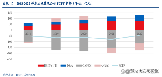 垃圾焚燒行業(yè) FCFF(自由現(xiàn)金流) 拆解。我們選取瀚藍(lán)環(huán)境、旺能環(huán)境、上海環(huán)境、中科環(huán)保、軍信股份、綠色動(dòng)力、城發(fā)環(huán)境和三峰環(huán)境 8 家質(zhì)地較純(垃圾焚燒占營收比重高,暫無明顯第二成長曲線邏輯)的公司作為樣本進(jìn)行分析:CAPEX 較重,F(xiàn)CFF 尚未轉(zhuǎn)正。垃圾焚燒行業(yè)的固定資產(chǎn)投資較重,據(jù)圖概算,垃 圾焚燒設(shè)施的單噸投資成本可達(dá) 50 萬元以上,CAPEX 對(duì)于 FCFF 的拖累極大,2020 年8 家上市公司的資本開支高達(dá)-182 億元,而同期的 EBIT*(1-T)僅為 59 億元。但此后隨著行業(yè)新中標(biāo)項(xiàng)目數(shù)量的減少,板塊的 CAPEX 也呈現(xiàn)下降趨勢,F(xiàn)CFF 明顯回升To G 生意占比較高,應(yīng)收賬款拖累營運(yùn)資本。垃圾焚燒公司的收入主要可以分為垃圾處理費(fèi)與上網(wǎng)電費(fèi),其中垃圾處理費(fèi)與政府結(jié)算向居民端的順價(jià)并不順利,上網(wǎng)電費(fèi)中標(biāo)桿電價(jià)與國家電網(wǎng)結(jié)算較為及時(shí),國補(bǔ)和省補(bǔ)均存在一定的拖欠。尤其 2020 年后垃圾焚燒電費(fèi)國補(bǔ)的發(fā)放進(jìn)度變緩后,ΔNWC 對(duì)于 FCFF 的貢獻(xiàn)也由正轉(zhuǎn)負(fù)。