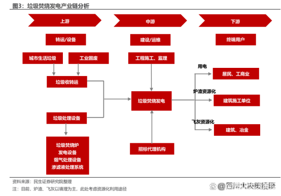 垃圾焚燒發(fā)電企業(yè)上游主要包括環(huán)衛(wèi)服務(wù)(收轉(zhuǎn)運(yùn))、垃圾處理設(shè)備;中游包括以垃圾焚燒發(fā)電廠為核心的相關(guān)招標(biāo)代理、建設(shè)、監(jiān)理等機(jī)構(gòu);下游既包括用電單位(居民、工商業(yè)等),也包括再生資源化產(chǎn)品用戶(建筑業(yè)、冶煉行業(yè)等)。