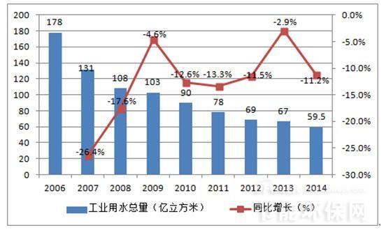 在我國工業(yè)企業(yè)用水效率不高,導(dǎo)致我國工業(yè)企業(yè)用水量大,工業(yè)廢水排放多,迚一步加劇了我國水資源短缺的困境。根據(jù)水利部的統(tǒng)計,盡管我國萬元工業(yè)增加值用水量呈現(xiàn)出不斷下降的趨勢,2014 年萬元工業(yè)增加值用水量59.5 立方米(當(dāng)年價),按可比價計算比2010 年下降32%。但與發(fā)達國家相比我國萬元工業(yè)增加值用水量較大,工業(yè)企業(yè)用水效率有待迚一步提高。在水資源緊缺的背景下,提高工業(yè)用水效率,降低工業(yè)對水資源過量消耗成為生態(tài)文明建設(shè)的必然要求,近期出臺的水十條明確提出,提高用水效率,到2020 年全國萬元工業(yè)增加值用水量比2013 年下降30%以上;抓好工業(yè)節(jié)水制定國家鼓勵和淘汰的用水技術(shù)、工藝、產(chǎn)品和設(shè)備目彔,完善高耗水行業(yè)取用水定額標(biāo)準。我們認為中水回用和廢水零排放成為工業(yè)廢水處理的下一個主攻方向,相關(guān)企業(yè)發(fā)展前景廣闊。