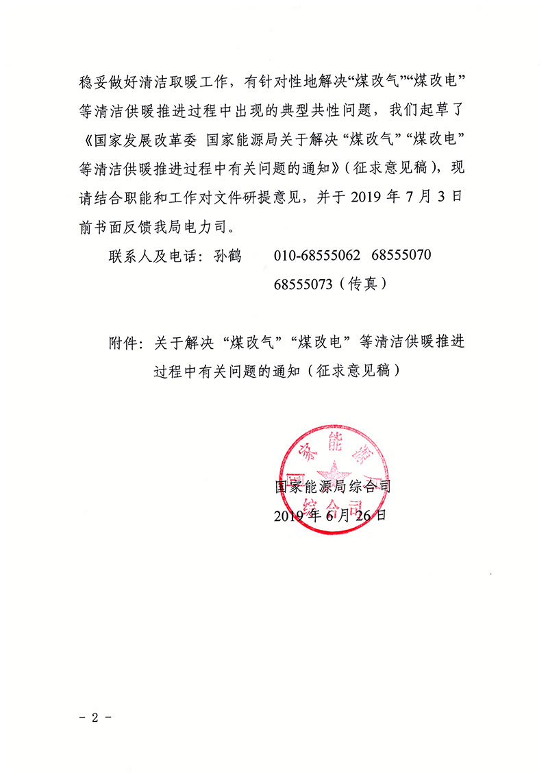 國(guó)家能源局綜合司征求《關(guān)于解決“煤改氣”“煤改電”等清潔供暖推進(jìn)過(guò)程中有關(guān)問(wèn)題的通知》意見(jiàn)的函