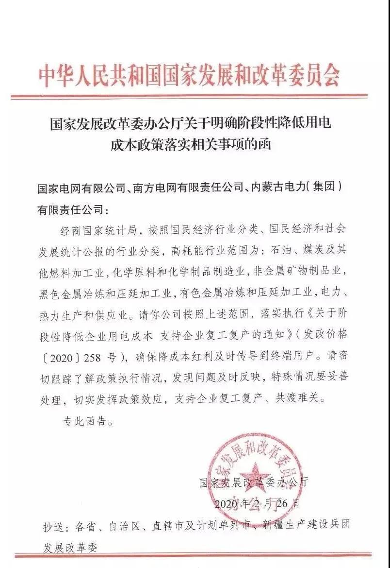近日,國家發(fā)展改革委印發(fā)《關于明確階段性降低用電成本政策落實相關事項的函》,函件中進一步明確高耗能行業(yè)范圍為:石油、煤炭及其他燃料加工業(yè),化學原料和化學制品制造業(yè),非金屬礦物制品業(yè),黑色金屬冶煉和壓延加工業(yè),有色金屬冶煉和壓延加工業(yè),電力、熱力生產(chǎn)和供應業(yè)。除以上行業(yè)外的工業(yè)用戶及全部商業(yè)用戶可享受電價95折優(yōu)惠。