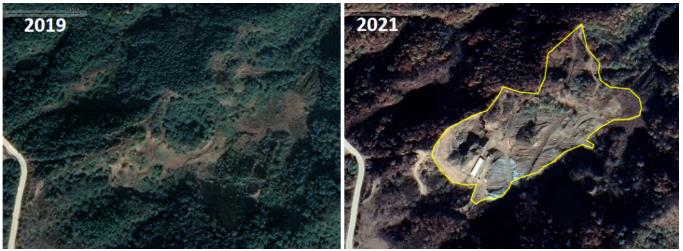 圖2 衛(wèi)星影像圖比對顯示,2019年以來興隆縣掛蘭峪鎮(zhèn)六撥子村一采礦點(diǎn)非法侵占六里坪獼猴省級自然保護(hù)區(qū)面積明顯增大