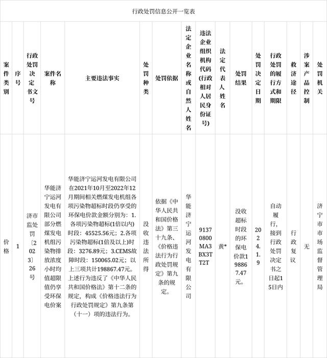 山東濟(jì)寧市市場監(jiān)督管理局近日對(duì)華能濟(jì)寧運(yùn)河發(fā)電有限公司部分燃煤發(fā)電機(jī)組污染物排放濃度小時(shí)均值超限值仍享受環(huán)保電價(jià)依法作出沒收超標(biāo)時(shí)段的環(huán)保電價(jià)款198867.47元的行政處罰,信息如下表: