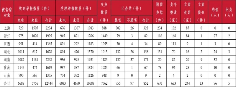截至5月20日晚20:00,各督察組共收到群眾來電、來信舉報(bào)12444件,受理有效舉報(bào)10683件,經(jīng)梳理合并重復(fù)舉報(bào),累計(jì)向被督察地方轉(zhuǎn)辦7562件;被督察地方已辦結(jié)或階段辦結(jié)1522件,其中立案處罰244家;立案偵查13件;約談黨政領(lǐng)導(dǎo)干部96人,問責(zé)黨政領(lǐng)導(dǎo)干部5人。