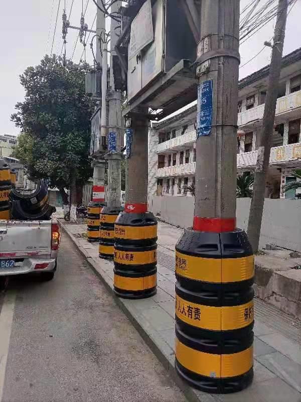 此次安裝的電桿防撞桶顏色為黃黑相間,格外醒目,上面印有國家電網(wǎng)標(biāo)志,中間印有警示標(biāo)語。防撞桶為塑料材質(zhì),外貼有反光條,具有緩沖撞擊力、夜間反光警示等功能,能有效提醒行人和車輛注意安全,極大地降低了電桿因外力因素而導(dǎo)致的破壞,確保電網(wǎng)安全可靠供電的同時(shí),保障客戶用電安全。