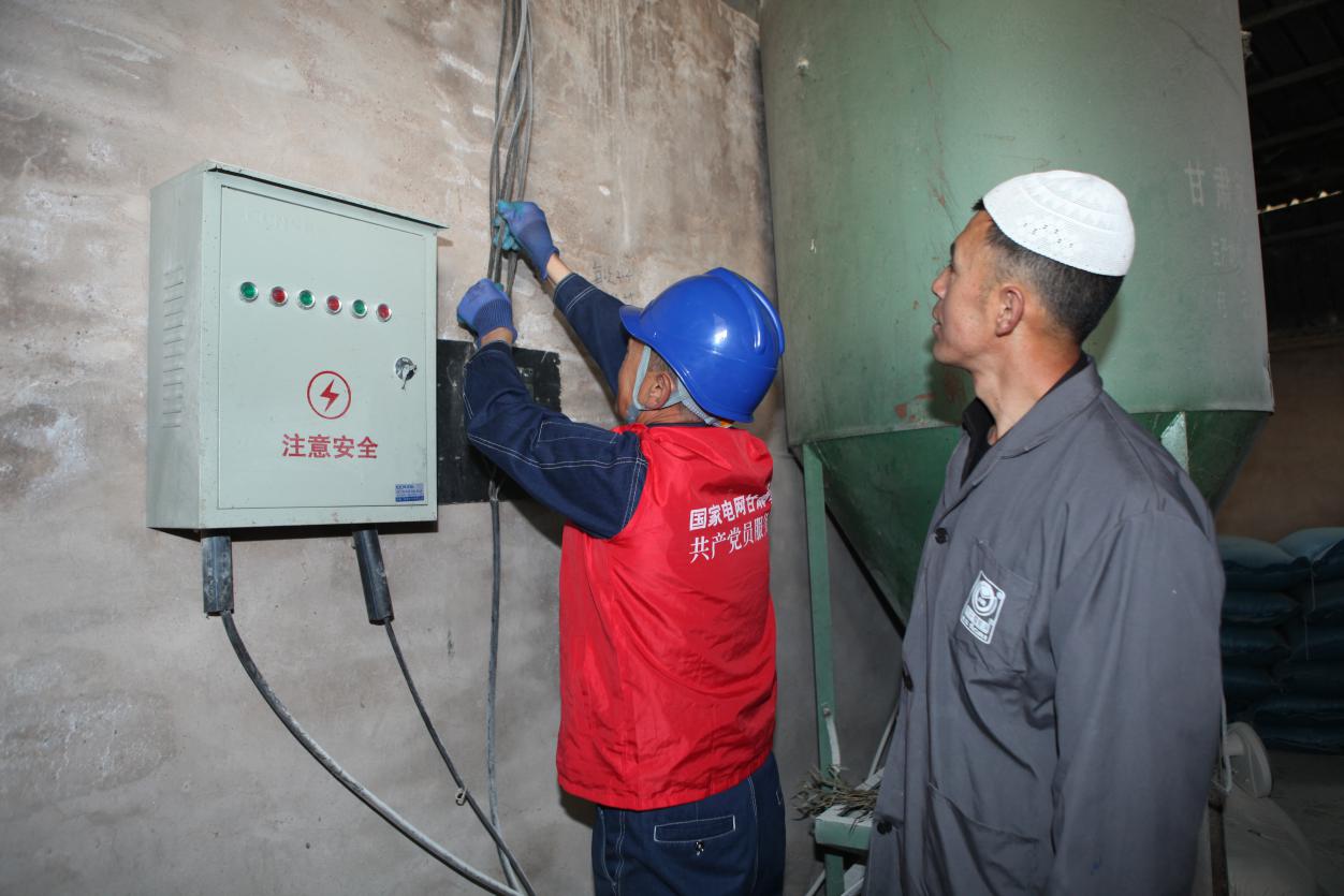 國(guó)家電網(wǎng)甘肅電力連心橋(臨夏馬進(jìn)偉)共產(chǎn)黨員服務(wù)隊(duì)隊(duì)員檢查養(yǎng)殖農(nóng)民專業(yè)合作社安全用電情況。