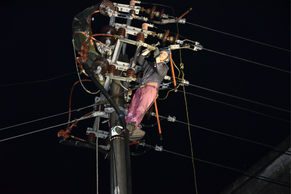 該線路斷線區(qū)域處于陡坡地勢(shì)復(fù)雜,且雨天較滑,搶修放線工作難度較大。在各部門的討論部署下,23名搶修人員做好搶修準(zhǔn)備工作趕往現(xiàn)場(chǎng)。盡管多方面原因?qū)е聯(lián)屝揠y度大、任務(wù)重,但搶修人員毫無怨言,大家只想讓停電用戶能夠盡早用上電。雨勢(shì)稍有減停,晚上8時(shí)在調(diào)度部門的許可下斷開10千伏亨泰線開關(guān),搶修人員做好相關(guān)安全防護(hù)措施,搶修工作有序進(jìn)行......