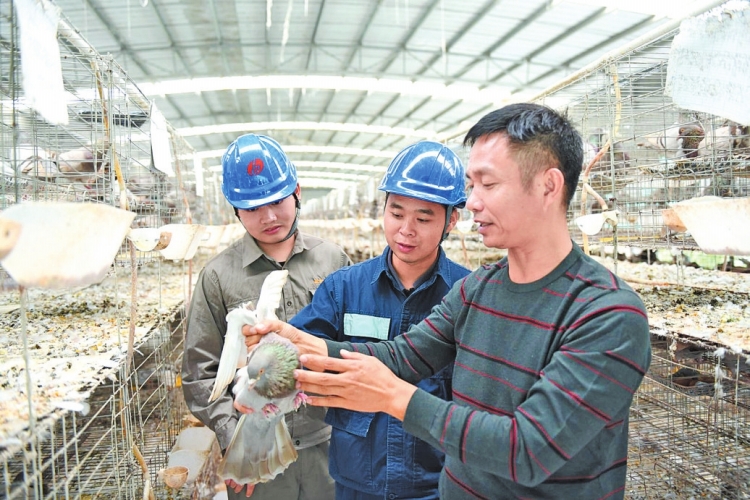 廣西新電力投資集團博白縣公司工作人員了解鴿子養(yǎng)殖扶貧車間用電需求。向建軍 攝