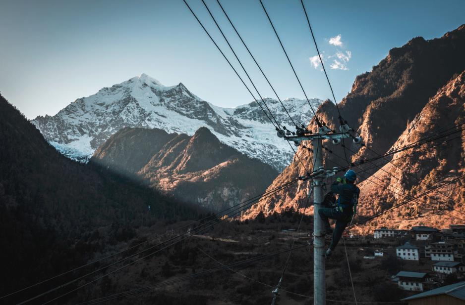 收到村民反映停電故障后,旺登一行立即開展檢查,發(fā)現(xiàn)故障出現(xiàn)在雨崩上村2號臺區(qū),且需要爬上12米高的電線桿進行作業(yè)。只見旺登綁緊安全帶,戴上絕緣手套,踩實腳扣,并進行簡短的沖擊試驗。隨后,他雙手扶住桿體,左腳穩(wěn)穩(wěn)地扣住,接著右腳向上提,一步一步交叉著往上。