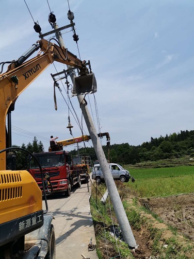 險情就是命令。敖溪供電所所長助理曾海林迅速組織搶修人員趕赴事故現場。7時25分,供電員工抵達現場,立即啟動突發(fā)事故搶修預案,并在現場 拉起了警戒線,避免車輛、行人靠近。確保現場安全措施到位后,曾海林協調挖掘機、吊車等設備就位,準備電桿、導線等施工材料,做好搶修前的各項準備工作。