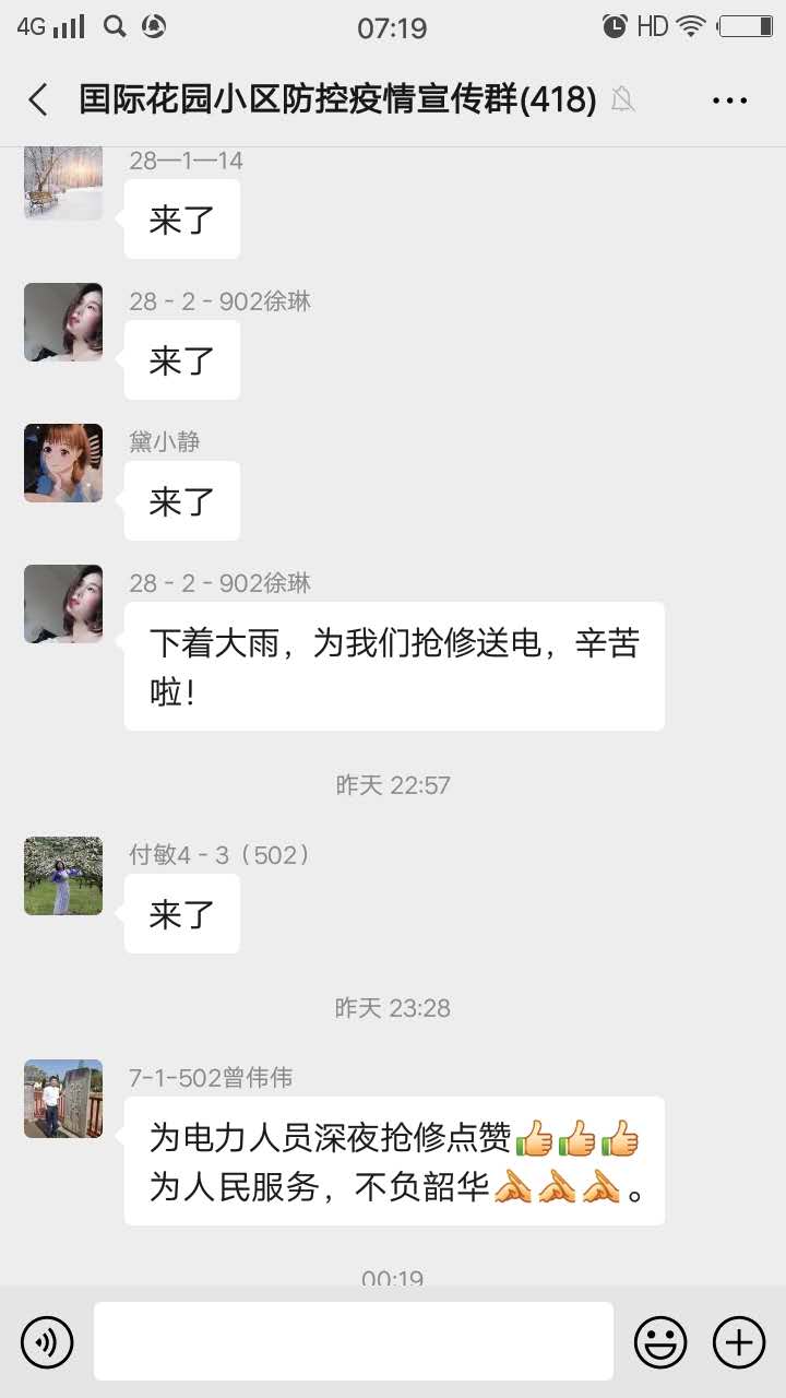 中國電力網(wǎng)訊  客戶又一次在微信群里表揚(yáng)國網(wǎng)南豐縣供電公司搶修人員“為人民服務(wù),不負(fù)韶華,”并為他們點(diǎn)贊。