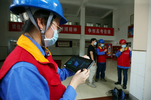 工作現(xiàn)場,黨員服務(wù)隊隊員歐競和她的同事正通過紅外測溫儀和超聲波故障測試儀,協(xié)助學(xué)校對配電設(shè)備進(jìn)行全方位“體檢”。她介紹說:“這個考點處于單電源供電狀態(tài),抗風(fēng)險能力相對較低,所以我們安排了發(fā)電車接入學(xué)校供電網(wǎng)絡(luò),確保高考用電‘雙保險’。”“太感謝你們了,先后多次過來幫我們檢查,我們心里踏實多了。”榮安中學(xué)教務(wù)處負(fù)責(zé)人向工作人員表示感謝。