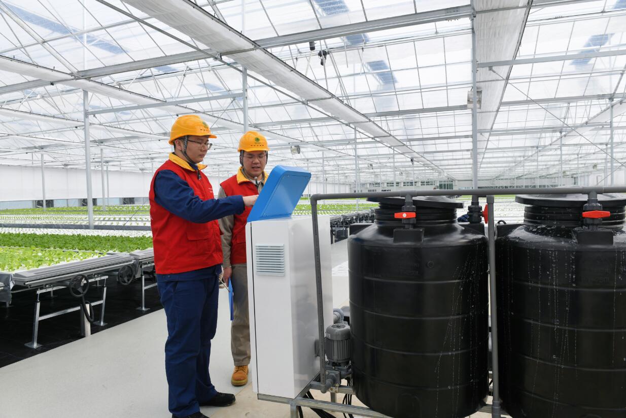 田野上的作物剛開(kāi)始生長(zhǎng),各種現(xiàn)代化大棚里的蔬菜已經(jīng)煥發(fā)了盎然的生機(jī)。在橫坎頭村的蔚藍(lán)智谷植物工廠里,綠油油的菠菜、生菜、小松菜等蔬菜種在整齊的培養(yǎng)基上,一個(gè)個(gè)高大的溫室大棚連在一起,猶如工廠的車間,工作人員通過(guò)智能系統(tǒng)控制著溫度、濕度和營(yíng)養(yǎng)液輸送。這樣的農(nóng)業(yè)種植模式打破了傳統(tǒng)的種植概念,將蔬菜種植“工廠化”,品質(zhì)和市場(chǎng)都得到了良好的保障。