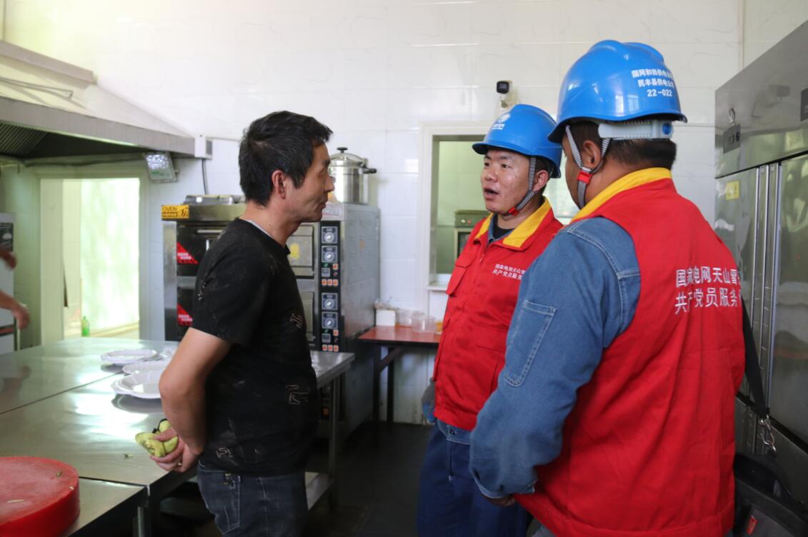 7月14日,新疆和田民豐供電公司黨員服務(wù)隊(duì)隊(duì)員滿繼武、伊德日斯·買提托合提在民豐縣尼亞灣鄉(xiāng)村人農(nóng)家樂(lè)了解客戶用電需求,普及電力安全知識(shí)。
