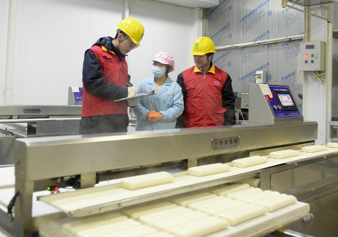 走進年糕生產(chǎn)車間,一條條生產(chǎn)線正全線運行。“制作年糕要經(jīng)過浸米、磨粉、壓干、上蒸等多道工序。”余元國介紹,隨著生產(chǎn)工藝的逐步改進,現(xiàn)在每個環(huán)節(jié)都實現(xiàn)了電氣化,可以通過淘米機、打粉機、蒸汽灶等一系列精密的設(shè)備來完成,工人們只需在一旁做一些輔助操作,大大地提高了生產(chǎn)效率,去年產(chǎn)值就達到了4000多萬元。