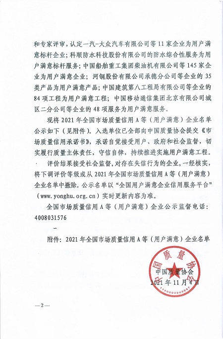 中國(guó)電力網(wǎng)訊 2021年11月18日,中國(guó)質(zhì)量協(xié)會(huì)發(fā)布了關(guān)于2021年全國(guó)市場(chǎng)質(zhì)量信用A等(用戶(hù)滿(mǎn)意)企業(yè)名單的通知(中國(guó)質(zhì)協(xié)字【2021】210號(hào)文)。經(jīng)過(guò)自愿申請(qǐng)、資料初審、第三方信用評(píng)價(jià)機(jī)構(gòu)評(píng)價(jià)和專(zhuān)家評(píng)審,國(guó)網(wǎng)湖南省東安縣供電分公司被評(píng)為用戶(hù)滿(mǎn)意企業(yè),市場(chǎng)質(zhì)量信用等級(jí)AA。