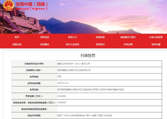 近日國網(wǎng)西藏電力有限公司江達(dá)縣供電公司因營業(yè)大廳內(nèi)未設(shè)置疏散指示標(biāo)志,被江達(dá)縣消防救援大隊(duì)給予罰款人民幣9100元整的行政處罰。