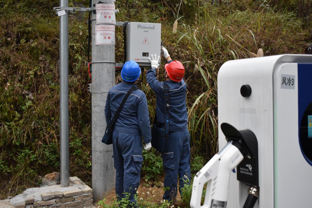 都勻荔波供電局組織青年服務(wù)隊對瑤山古寨充電樁運行情況進(jìn)行安全排查 王文濤攝