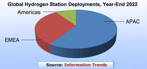 Information Trends名為《2023年全球加氫站市場》的研究表明,目前全球范圍內(nèi)以中國為首的加氫站部署勢頭強勁。美國則遠遠落后,但世界其他國家/地區(qū)正在迅速推動氫能發(fā)展以滿足其能源需求。