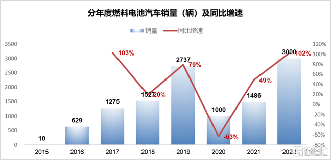 2022年氫燃料汽車市場(chǎng)銷量整體翻倍,平均裝車電量也有了大幅提升,所以不是市場(chǎng)總量的原因。