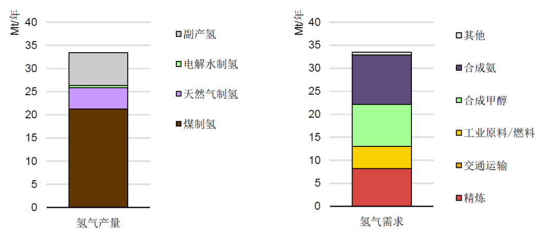 氫是重要工業(yè)原料,在合成氨、合成甲醇、石油煉化中廣泛使用,也是金屬冶煉的重要原料,廣泛用于鎢、鉬、鈷、鐵等金屬和鍺、硅的生產。根據國際能源署(IEA)統(tǒng)計數據,中國2020年氫氣生產和消費量約3300萬噸,生產方面絕大多數來自于煤、天然氣等化石能源,消費方面主要是合成氨、合成甲醇、石油煉化等。