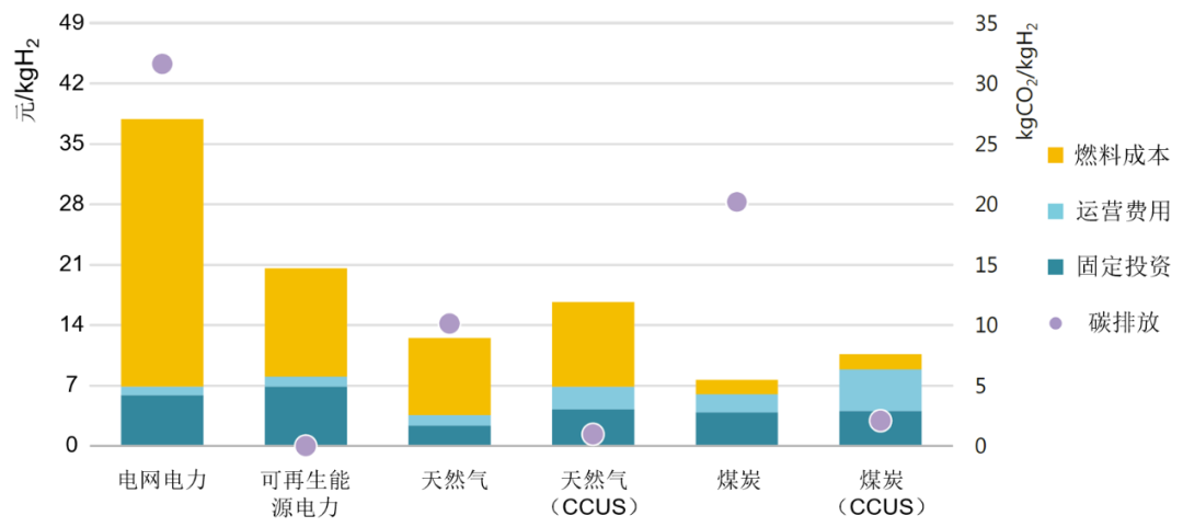 對比傳統(tǒng)化石燃料制氫,可再生能源制氫技術現(xiàn)階段并不具備經濟性競爭優(yōu)勢,但是考慮減排效益,結合可再生能源的電解水制氫是綠色氫能發(fā)展的必然選擇。隨著可再生能源規(guī)模不斷擴大,可再生能源電力成本仍會進一步下降,相應的電解水制氫成本也將持續(xù)下降。
