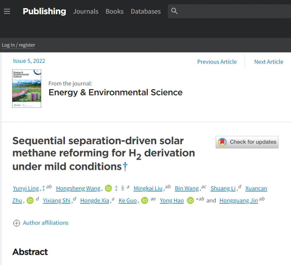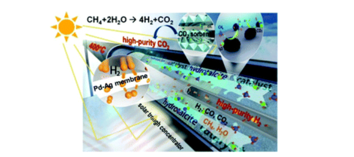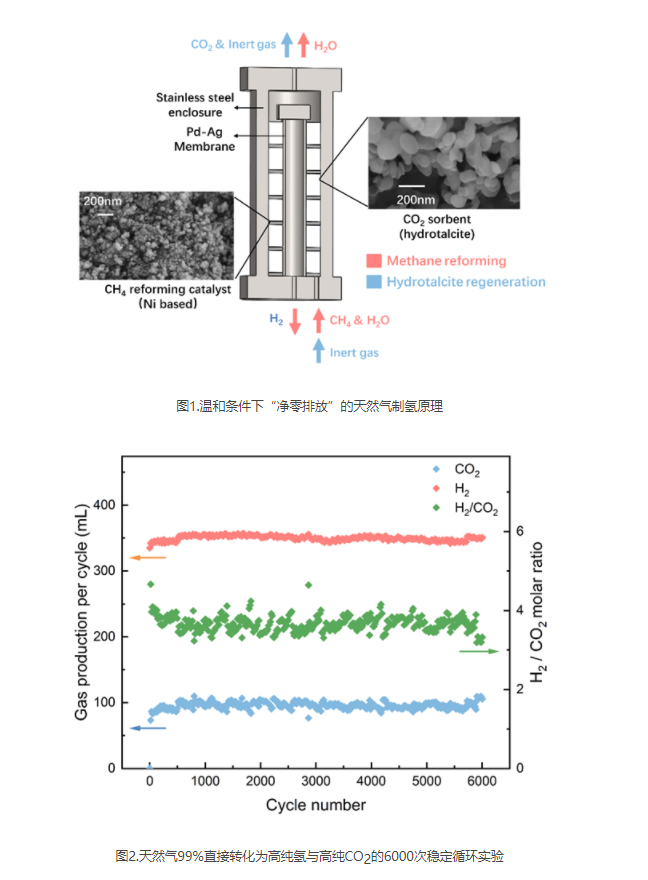 中國科學院工程熱物理研究所首次實現(xiàn)了400°C溫和條件下“凈零排放”的天然氣制氫原理突破。通過有序分離氫氣和二氧化碳產(chǎn)物,天然氣制氫反應溫度由傳統(tǒng)的800-1000°C降至400°C以下,實現(xiàn)了99%以上甲烷直接轉(zhuǎn)化為高純氫與高純二氧化碳,并實現(xiàn)了基于化石能源的制氫與脫碳的完全協(xié)同。制氫與脫碳能耗下降幅度達20-40%?;诖?,該工作結(jié)合商業(yè)化中溫槽式聚光技術(shù),實現(xiàn)了太陽能驅(qū)動的天然氣制氫與脫碳,進一步減少化石能源制氫的碳足跡,展示了化石能源與可再生能源互補實現(xiàn)可持續(xù)氫能利用的可行性。反應溫度的降低使工業(yè)余熱與氫能的結(jié)合成為可能。迄今為止,研究人員已完成了超過6000次的穩(wěn)定循環(huán)實驗,驗證了該方法的可靠性,并初步展示了技術(shù)轉(zhuǎn)化應用的廣闊前景。