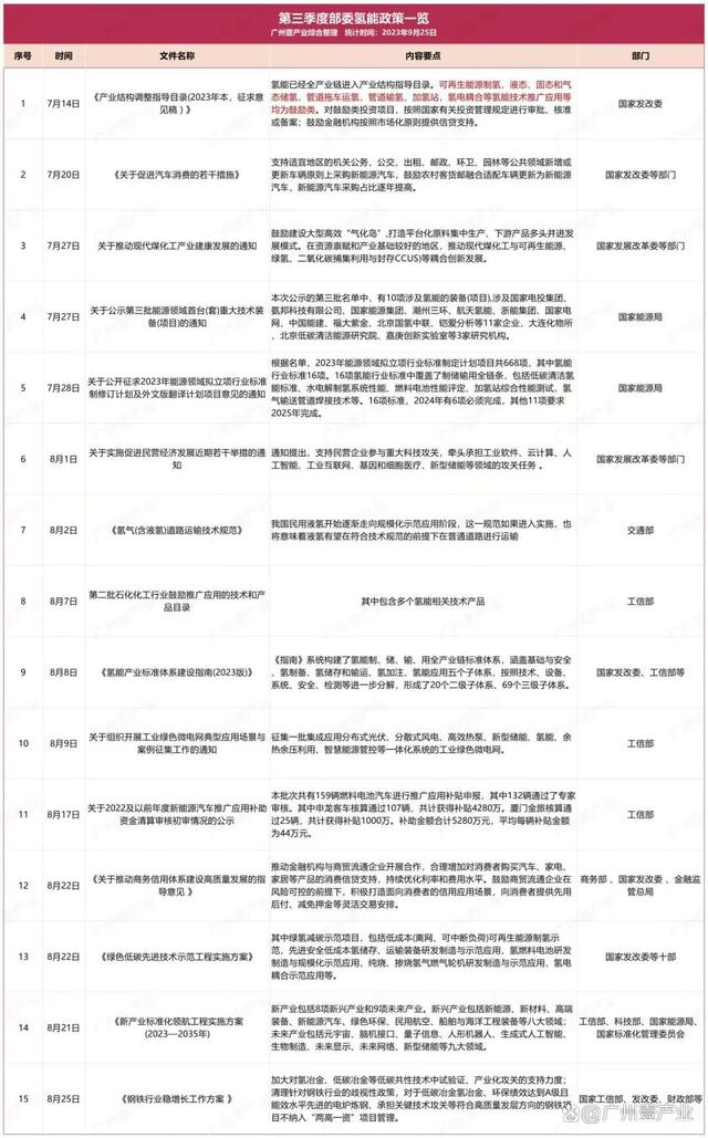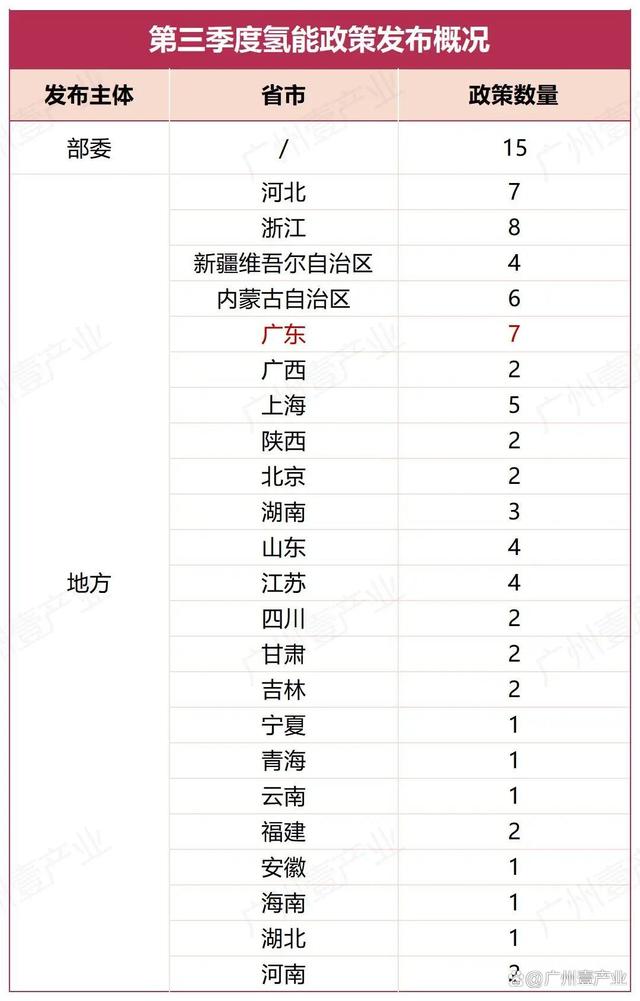 9月17日,浙江省嵊州市人民政府發(fā)布了《關(guān)于加快推進新能源裝備產(chǎn)業(yè)高質(zhì)量發(fā)展的實施意見(征求意見稿)》。其中提到,積極布局發(fā)展氫能產(chǎn)業(yè)。布局發(fā)展氫能“制儲輸用”、氫燃料電池系統(tǒng)等氫能產(chǎn)業(yè)鏈。9月14日,山東省能源局發(fā)布了《關(guān)于開展能源綠色低碳轉(zhuǎn)型試點示范建設(shè)工作的通知》。文件中涉及到氫能的內(nèi)容有:鼓勵發(fā)展風(fēng)電、光伏發(fā)電制氫,培育可再生能源開發(fā)利用新模式新業(yè)態(tài);積極推進核能海水淡化、核能制氫等研究示范等。9月13日,佛山市人民政府印發(fā)了《佛山市碳達峰實施方案》的通知。方案中提到,重點發(fā)展氫能產(chǎn)業(yè)。牽頭推進廣東燃料電池汽車示范應(yīng)用城市群建設(shè),強化城市群內(nèi)各市資源共享、優(yōu)勢互補。加強氫能基礎(chǔ)設(shè)施建設(shè)。推動氫能示范應(yīng)用擴面,促進氫能產(chǎn)業(yè)要素集聚,培育引進優(yōu)勢骨干企業(yè),實現(xiàn)氫能產(chǎn)業(yè)強鏈補鏈,打造大灣區(qū)氫能產(chǎn)業(yè)高地。持續(xù)推動南海區(qū)“仙湖氫谷”、一汽解放南方新能源汽車基地等園區(qū)載體建設(shè)。到2025年,培育氫能及燃料電池企業(yè)超過170家,到2030年,培育氫能及燃料電池企業(yè)超過200家。......據(jù)廣州壹產(chǎn)業(yè)不完全統(tǒng)計,截至9月25日,今年第三季度(7、8、9月),部委共發(fā)布15條與氫能相關(guān)的政策,地方則有23個省(市)發(fā)布了70條氫能政策,合計85條。