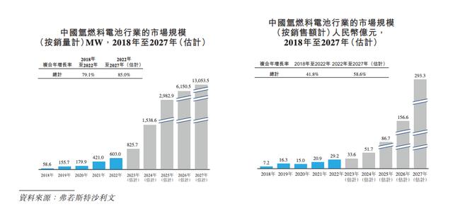 而中國(guó)氫燃料電池行業(yè)的市場(chǎng)規(guī)模也已由2018年的人民幣7億元增至2022年的29億元,復(fù)合年增長(zhǎng)率為41.8%。預(yù)計(jì)將于2027年達(dá)到人民幣293億元。