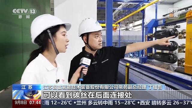 江蘇國富氫能技術(shù)裝備股份有限公司常務(wù)副總經(jīng)理 丁鐳哲:這里是我們的核心工藝之一,碳纖維纏繞。你可以看到碳絲在后面連接處,就像一個(gè)織布機(jī)一樣,一層一層往上織。碳纖維主要是用來承壓的。