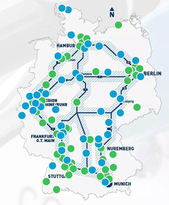 H2M在德國已經(jīng)運營(綠色)及在建加氫站(藍(lán)色)示意圖