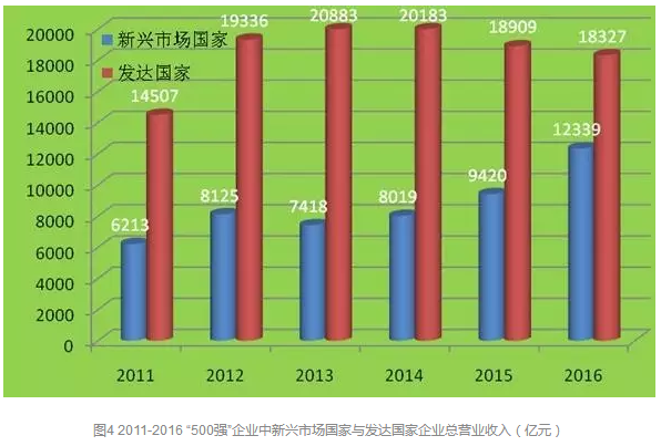 圖5則給出了2011-2016 “500強”企業(yè)中新興市場國家與發(fā)達國家企業(yè)總營業(yè)收入占比情況。此圖更直觀的印證了上述趨勢。
