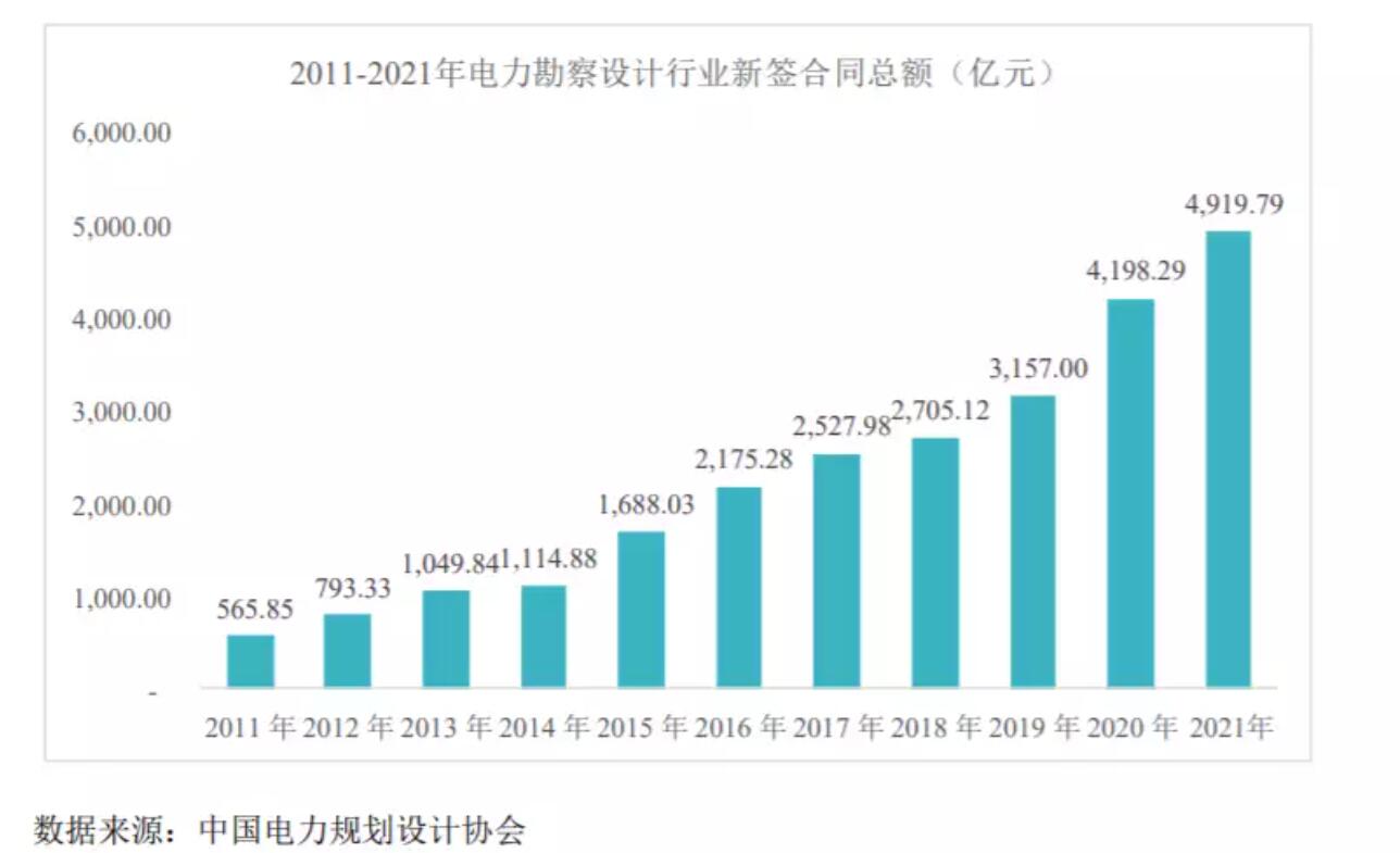 近年來,我國電力勘察設(shè)計行業(yè)發(fā)展迅猛,年新簽合同總額總體呈現(xiàn)上升趨勢。根據(jù)中國電力規(guī)劃設(shè)計協(xié)會發(fā)布的電力勘察設(shè)計行業(yè)各年度統(tǒng)計數(shù)據(jù)顯示,2021年行業(yè)新簽合同金額為4,919.79億元,較2020年增長17.19%。