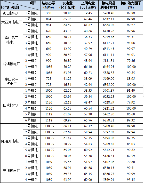 3)本表“合計值/整體值/平均值”中,裝機(jī)容量、發(fā)電量、上網(wǎng)電量為各機(jī)組合計值,核電設(shè)備利用小時數(shù)為全部機(jī)組整體值,機(jī)組能力因子為全部參與統(tǒng)計的機(jī)組的算數(shù)平均值。