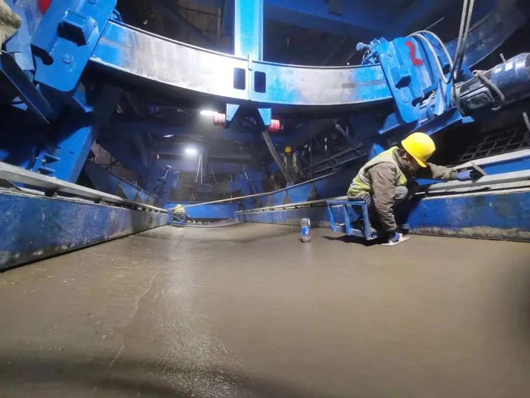 有壓段全斷面首倉混凝土澆筑成功拉哇水電站泄洪洞有壓段隧洞段洞長456.60米,洞室埋設(shè)85米,屬世界級(jí)埋深的泄洪洞。施工過程中,面臨著保證混凝土密實(shí)度、表面平整度、光滑度、減少氣泡和裂縫等施工重難點(diǎn),為滿足提前半年發(fā)電目標(biāo)要求,項(xiàng)目部全力加快施工進(jìn)度,并做好已澆筑底板的表面保護(hù)工作。相比較于泄洪洞無壓段首倉,有壓段全斷面首倉混凝土澆筑首次采用全圓針梁底拱橫向滑模襯砌鋼模臺(tái)車,以此達(dá)到支模、收模良好效果。