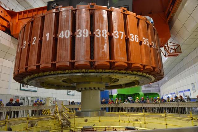 上午8時(shí)58分,新轉(zhuǎn)子起吊工作開(kāi)始,通過(guò)三起三落試吊后,正式起吊、平移,從安裝場(chǎng)支墩緩緩升起,向1號(hào)機(jī)坑處平穩(wěn)移去。到達(dá)機(jī)坑上方后,經(jīng)過(guò)準(zhǔn)確的中心調(diào)整,轉(zhuǎn)子緩慢下落,間隙監(jiān)測(cè)員們手持間隙墊條在轉(zhuǎn)子與定子之間的氣隙中移動(dòng),確保吊入過(guò)程中氣隙正常,平穩(wěn)吊入預(yù)定位置。