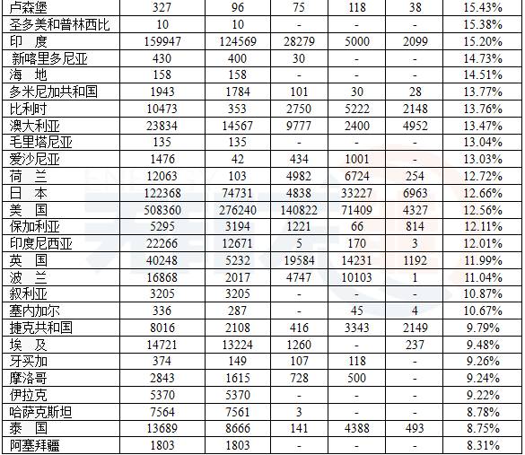 表2列出了154個(gè)國家的再生能源發(fā)電量,并有占發(fā)電總量的百分率;而且有再生能源發(fā)電總量的構(gòu)成。數(shù)據(jù)取自2012~2015年各國的數(shù)據(jù),當(dāng)然數(shù)據(jù)會(huì)不斷更新,但只會(huì)更好。由于地?zé)岚l(fā)電量小,未列入表中。