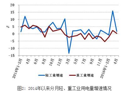 1-4月份,全國工業(yè)用電量12369億千瓦時(shí),同比增長0.2%,增速比上年同期提高1.0個(gè)百分點(diǎn),占全社會(huì)用電量的比重為68.4%,對全社會(huì)用電量增長的貢獻(xiàn)率為4.5%。其中,輕工業(yè)用電量2075億千瓦時(shí),同比增長3.6%,增速比上年同期提高1.7個(gè)百分點(diǎn);重工業(yè)用電量為10295億千瓦時(shí),同比下降0.5%,增速比上年同期提高0.8個(gè)百分點(diǎn)。