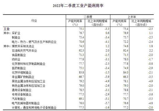 分三大門類看,二季度,采礦業(yè)產(chǎn)能利用率為76.7%,比上年同期上升0.6個(gè)百分點(diǎn);制造業(yè)產(chǎn)能利用率為75.4%,下降3.4個(gè)百分點(diǎn);電力、熱力、燃?xì)饧八a(chǎn)和供應(yīng)業(yè)產(chǎn)能利用率為70.6%,下降4.1個(gè)百分點(diǎn)。