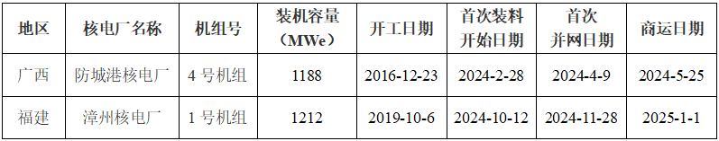 1)漳州核電廠1號機(jī)組2024年10月12日裝料,本表格中發(fā)電量及上網(wǎng)電量數(shù)據(jù)為調(diào)試期間電量,能力因子暫無數(shù)據(jù)。