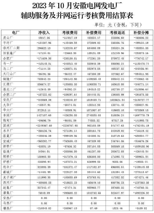 附件:2023年10-12月安徽電網發(fā)電廠輔助服務及并網運行考核費用結算表